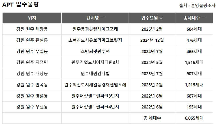 위에 입주물량을 보시면 앞으로의 입주물량은 이전보다 확연히 줄어듭니다. 입주물량이 줄어든다는 것은 공급이 줄어든다는 것이고, 공급이 수요보다 적게 되면 가격은 오르게 되어 있습니다. 그런 면에서 현재 원주는 나쁘지 않은 투자처로 보입니다. 구체적으로 어느 동에 아파트가 들어오는지는 아래 표를 확인해주시기 바랍니다. 출처는 '아실'에서 받아왔습니다.
