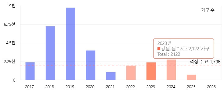 우선 원주시의 지금까지의 입주물량과 앞으로의 입주물량을 확인해 보겠습니다. 이를 먼저 확인하는 이유는 원주 무실동 제일풍경채가 과연 얼마나 매력적인지 확인하기 위함입니다. 애초에 매력 없는, 다시 말해 투자할 가치가 없는 곳이라면 분양을 언제 하든 얼마에 하든 상관이 없겠죠. 원주시 집값의 미래는 어떻게 될까요?