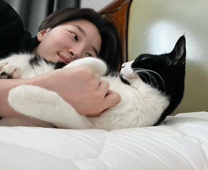 1남 1녀 중 장녀입니다. 반려묘를 2마리를 키우고 있는데 이름이 태양과 밤이라고 해요. 두 고양이 모두 매우 순한 편이라고 합니다. 그래도 그 중에서는 태양이가 더 질투가 많다고 합니다.