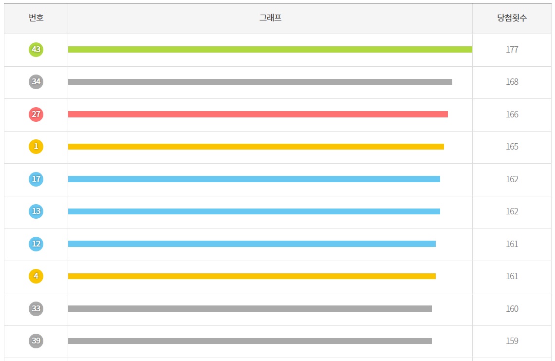 43번이 177회로 1등입니다. 34번이 168회로 2등이네요. 27번이 166회로 간발의 차이로 3등. 1번이 4등. 17번이 5등입니다. 신기하게도 1위부터 5위까지 십의 자리 숫자가 다르네요. 그리고 더 재미있는 사실은 40~45번을 대표하는 43번이 1등이라는 것입니다. 확률로 따져보면 40번 대 숫자가 나올 확률이 가장 적은데 실제로는 40번 대가 1등입니다.