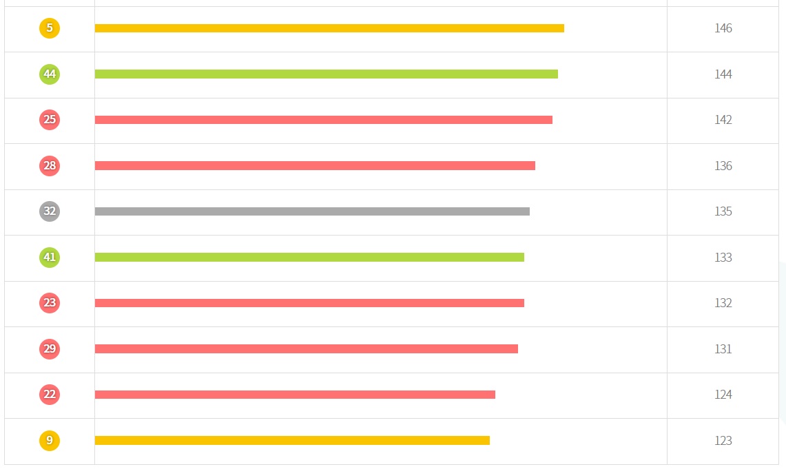모든 숫자는 당첨 확률이 각각 1/45로 같지만 그래도 꼴등은 존재합니다. 꼴찌는 바로 9번입니다. 꼴찌인 이유는... 아무 이유 없습니다. 그저 운이 안 좋았을 뿐이죠. 여기에서도 신기한 점이 있는데 20번 대가 절반을 차지하고 30번대는 하나 뿐이라는 것입니다. 20번대가 이렇게 안 나왔었다니 신기합니다.