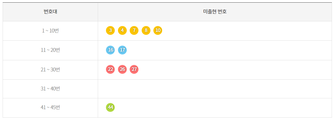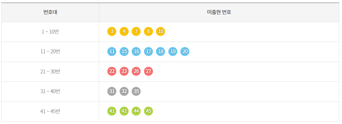 5주간 나오지 않은 번호들에 비해 10주간 나오지 않은 번호들은 확실히 줄었습니다. 하지만 눈에 띄는 부분이 있죠? 바로 1~10번이 최근 5주와 최근 10주가 똑같다는 것입니다. 한 자리 숫자가 중복되어 나왔거나 잘 나오지 않았다고 볼 수 있습니다. 그런데 나머지 미출현 번호들이 5주에 비해 많이 줄은 것으로 보아 후자가 맞아 보입니다.